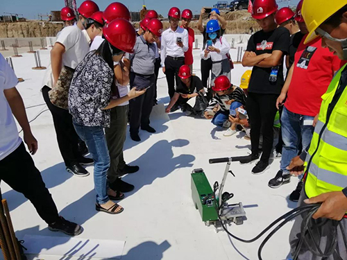 在隨后的項(xiàng)目參觀中,合伙人通過參與熱風(fēng)焊接TPO卷材性能的講解、實(shí)操等環(huán)節(jié),了解東方雨虹的產(chǎn)品和工法,以及如何提升工程質(zhì)量、有效縮短工期。