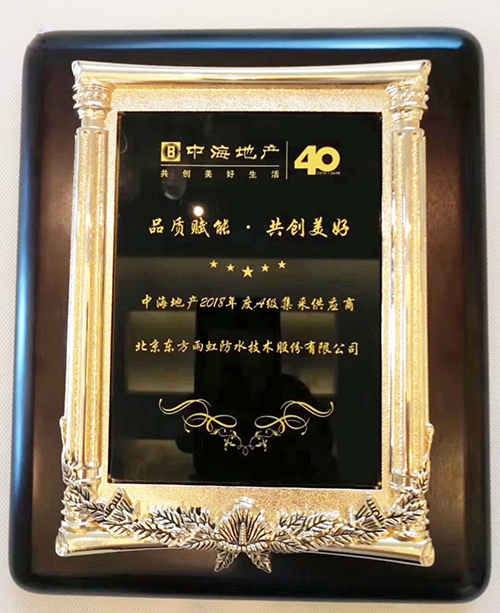 6月26日,“品質賦能、共創美好——中海地產2019年度集采供應商大會”在深圳召開,此次大會是中海地產集團成立40周年以來召開的首次A級供應商大會。東方雨虹憑借優質的產品和系統服務,榮獲“中海地產2018年度A級集采供應商”稱號。