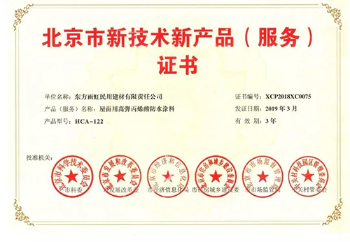 近日,雨虹防水自主研發生產的三款產品HCA-122屋面用高彈丙烯酸防水涂料、雨虹300自修復型防水涂料、L100靚縫劑獲得北京市科學技術委員會、北京市發展和改革委員會、北京市經濟和信息化局、北京市住房和城鄉建設委員會、北京市市場監督管理局、中關村科技園區管理委員會等聯合頒發的《北京市新技術新產品(服務)證書》。