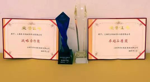 3月31日,寶龍地產2019年度戰略供方大會在上海寶龍艾美酒店召開。東方雨虹憑借卓越的品質及高效的服務榮獲“卓越品質獎”“戰略合作獎”。