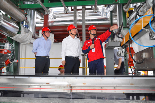 王成長聽取徐庭忠對生產(chǎn)設(shè)備的介紹