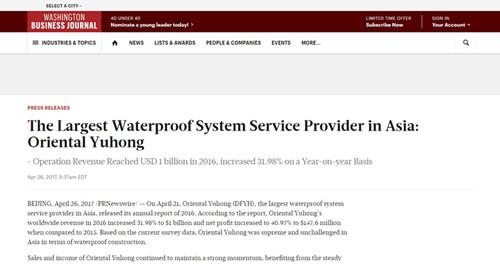 東方雨虹的市場(chǎng)表現(xiàn)都有著中國(guó)建筑防水領(lǐng)域風(fēng)向標(biāo)的作用。4月21日,東方雨虹發(fā)布2016年年報(bào),據(jù)報(bào)告顯示,2016年?yáng)|方雨虹實(shí)現(xiàn)營(yíng)業(yè)總收入70億元,同比增長(zhǎng)31.98%;凈利潤(rùn)10.29億元,同比增長(zhǎng)40.97%。如此靚麗的成績(jī)單一經(jīng)發(fā)布,受到了包括Yahoo!、Washington Business Journal、TheStreet、MarketWatch等200余家國(guó)際媒體的關(guān)注。