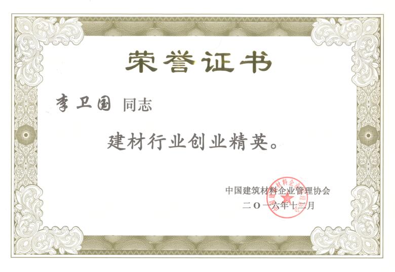 近日,“中國建筑材料企業(yè)管理協(xié)會成立30周年座談會暨2016年全國建材行業(yè)優(yōu)秀企業(yè)家發(fā)布會”在北京成功召開。東方雨虹董事長李衛(wèi)國榮獲“建材行業(yè)創(chuàng)業(yè)精英”稱號。