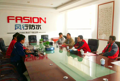 參觀結(jié)束后,大家齊聚會(huì)議室,陳坤為大家簡(jiǎn)要介紹了公司的發(fā)展歷程、現(xiàn)狀及基地的產(chǎn)能實(shí)力,參觀組對(duì)風(fēng)行防水有了進(jìn)一步的認(rèn)識(shí),并通過(guò)交流,了解了公司的產(chǎn)品體系及標(biāo)準(zhǔn)化施工,對(duì)風(fēng)行防水的產(chǎn)品質(zhì)量、施工技術(shù)、品牌信譽(yù)、服務(wù)體系給予了充分肯定,表示希望有機(jī)會(huì)能就產(chǎn)品體系開(kāi)展深入的技術(shù)交流。