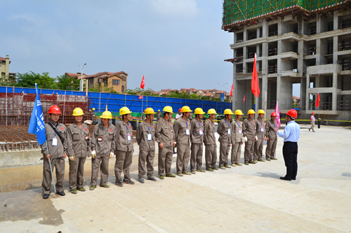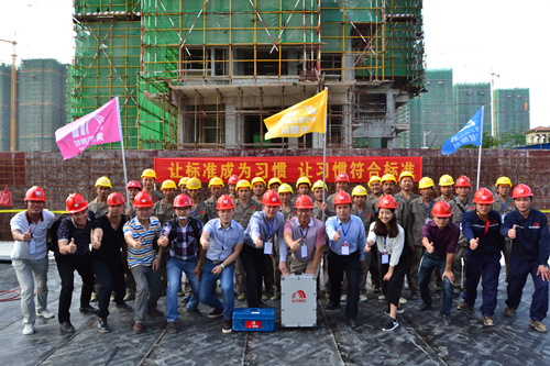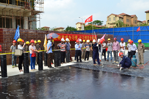 為提高防水工程施工質量和施工現場管理水平,解決因施工粗放而導致建筑滲漏率居高不下的問題,切實打造優質防水工程,東方雨虹決心在全國推行防水標準化施工服務體系。4月25日,東方雨虹工程渠道事業部與南寧東方雨虹防水工程有限公司共同組織舉辦了防水示范工地觀摩交流活動----東方雨虹嘉和城白鷺郡南山項目防水標準化施工推介會。   嘉和城項目施工現場警戒線、標示牌、司旗等一應俱全,工人們統一著裝,以良好的風貌列隊進場,嚴格執行標準化施工的要求。