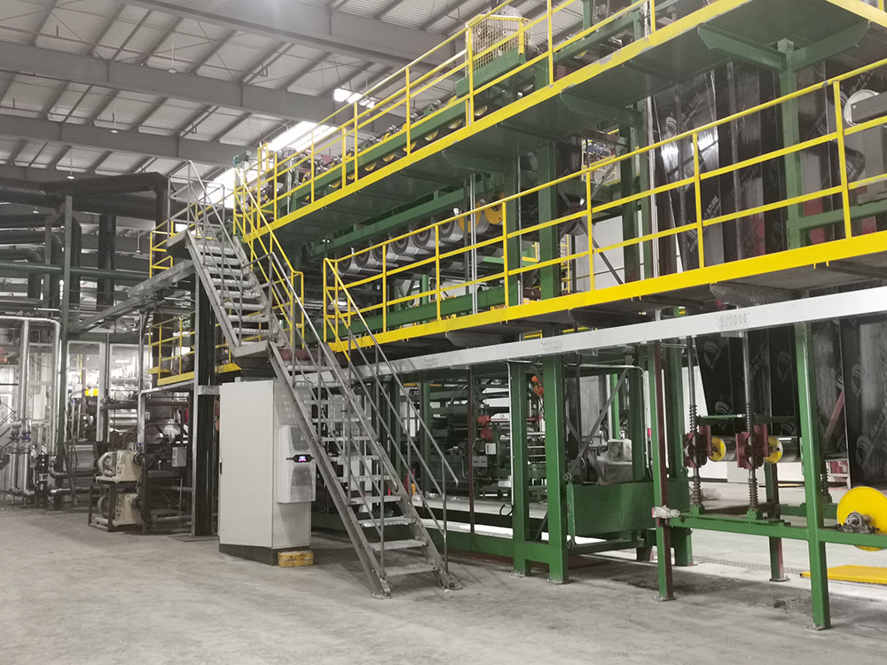 據悉,此條自研組合卷材生產線可實現有胎、無胎卷材的自由切換生產,年產1500萬平方米改性瀝青防水卷材,通過傳感技術,從前端原材料導入到末端產品碼垛,實現各環節有序銜接,進一步保證生產線的效率,增強產品的性能穩定,實現數字化生產。