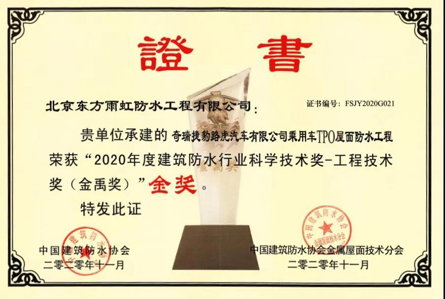 近日,中國建筑防水協(xié)會和《中國建筑防水》雜志社聯(lián)合在全行業(yè)開展了2020年度“建筑防水行業(yè)科學技術(shù)獎——工程技術(shù)獎(金禹獎)”評選活動。東方雨虹(ORIENTAL YUHONG)3項承建項目分別獲2020年度 “建筑防水行業(yè)科學技術(shù)獎——工程技術(shù)獎(金禹獎)”金獎,“建筑防水行業(yè)科學技術(shù)獎——工程技術(shù)獎(金屬圍護系統(tǒng)金禹獎)”金獎、銀獎。評選活動開展的7年間,東方雨虹(ORIENTAL YUHONG)已獲金獎11枚,銀獎6枚。