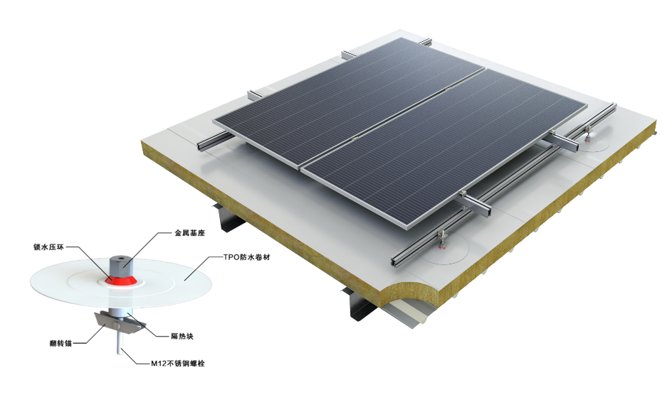 系統(tǒng)可適配虹昇輕量化光伏基座,利用輕量化光伏基座為分布式光伏提供安裝支點(diǎn),基座下部通過翻轉(zhuǎn)錨與鋼板固定,上部金屬件與TPO卷材在工廠預(yù)制成型直接與既有柔性卷材進(jìn)行焊接。光伏基座與鋼板連接牢固同時(shí)確保節(jié)點(diǎn)處的防水效果,有利于后期屋面光伏電站的長(zhǎng)期穩(wěn)定運(yùn)行。