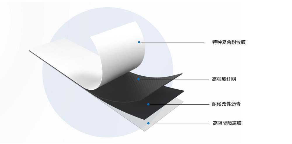 可外露使用5-8年:自主研發的復合耐候膜與耐候改性瀝青,具有優異的耐候性和尺寸穩定性,可使卷材長期保持粘性。人工加速老化試驗后,拉力強度可保持≧700N/50mm*。